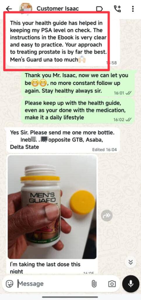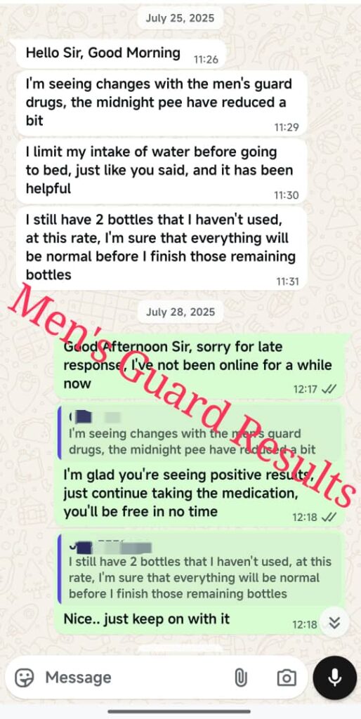 My enlarged prostate made traveling impossible. I couldn’t drive for 30 minutes without looking for a place to urinate. It was humiliating. After using Men’s Guard Herbal Remedy, that problem ended completely. Now I can drive from Owerri to Enugu nonstop! This is not hype this remedy truly works.