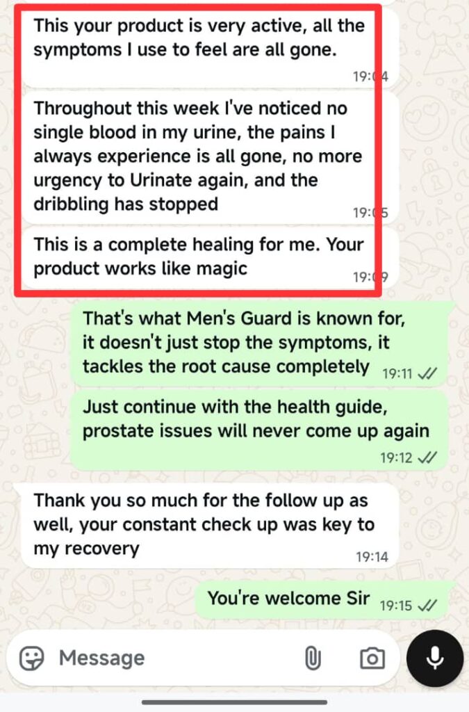 I used to think prostate enlargement was a problem for older men until I was diagnosed at 41. I couldn’t sit through meetings or even attend church without standing up to ease myself. I tried antibiotics and several hospital prescriptions, but nothing gave lasting results. Men’s Guard Herbal Remedy changed my story. Within a month, the constant urge reduced, and I finally sleep peacefully. This product is a blessing to men suffering from enlarged prostate.