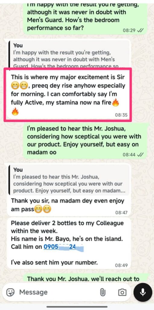 Yes. Men’s Guard is 100% natural and NAFDAC-approved. It contains no synthetic chemicals, no steroids, and no harmful additives. Unlike common hospital drugs that can cause dizziness, weakness, or affect performance, Men’s Guard is designed to support your prostate health naturally and without side effects.