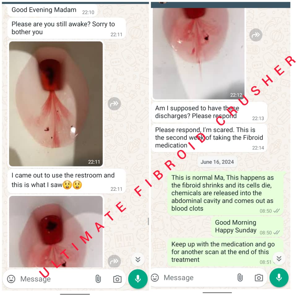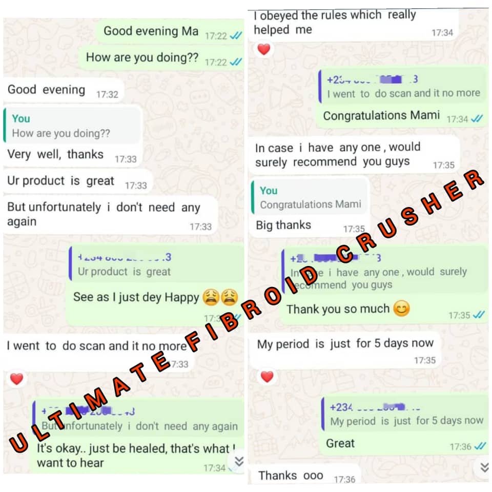 “Ultimate Fibroid Crusher normalized my heavy menstrual period in 5 weeks of usage and now my period is normal and pain free, I highly recommend.” – Grace M. [Benue State]