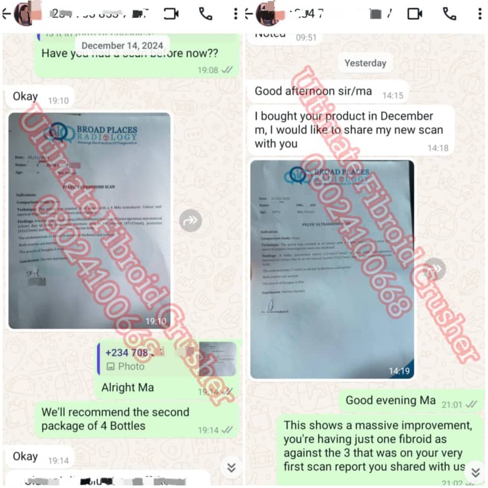 with permission from some of our patients, see the shocking scan results of how fibroid reduced over time while using ultimate fibroid crusher.